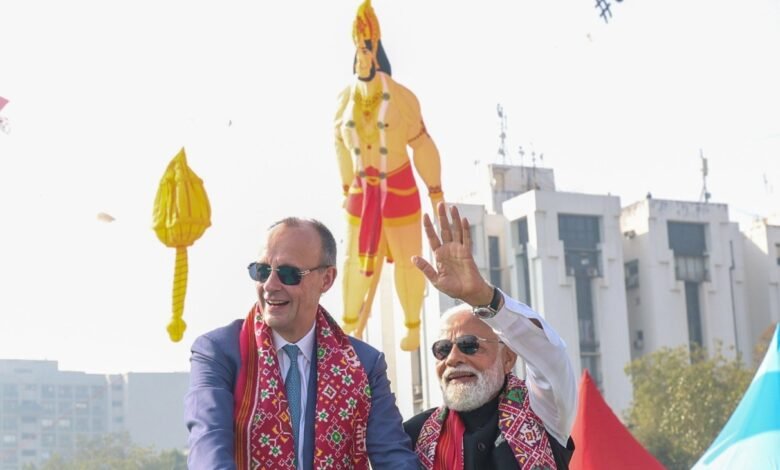 प्रधानमंत्री नरेंद्र मोदी और जर्मन चांसलर फ्रेडरिक मर्ज़ ने अहमदाबाद के साबरमती रिवरफ्रंट पर इंटरनेशनल काइट फेस्टिवल (IKF) 2026 का उद्घाटन किया।